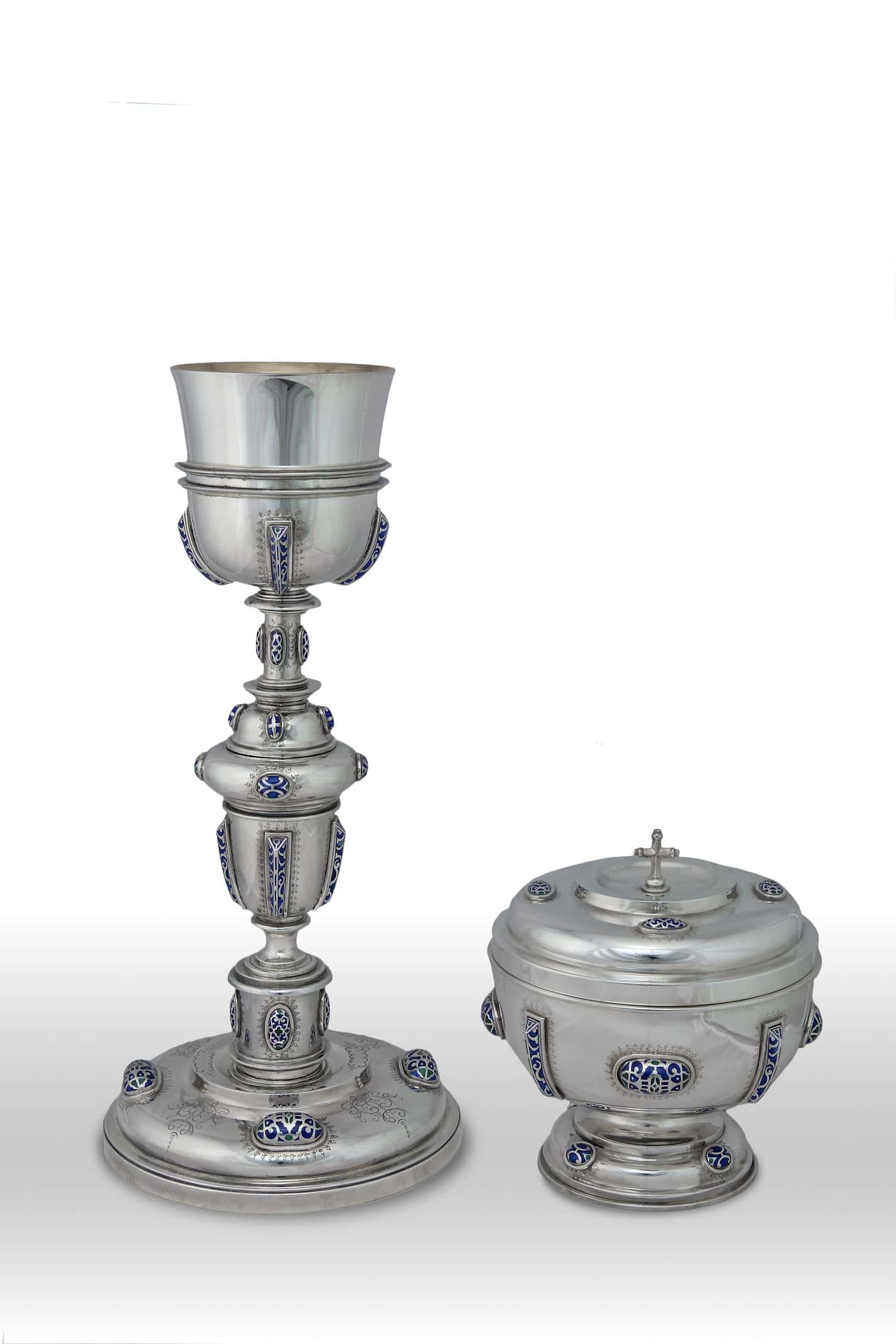 Se trata de un cáliz y una patena–copón elaborados en plata, con un trabajo artesanal de gran finura. Ambas piezas presentan cabujones decorativos realizados en esmalte al fuego, lo que aporta colores intensos y una apariencia vítrea que resalta sobre el metal noble.