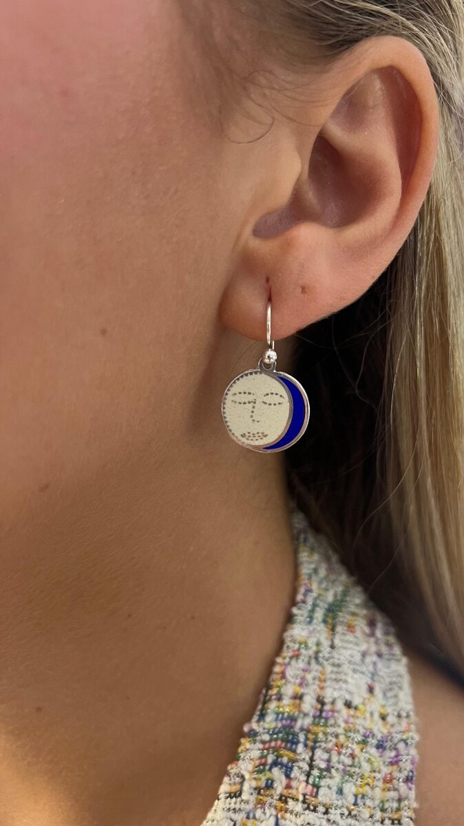 1. Pendiente de plata con diseño de luna y cara sonriente, elaborado a mano por Rafael Moreno en Granada desde 1948.
