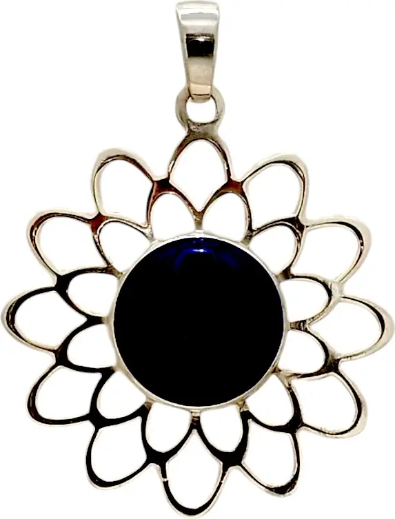 Un colgante con diseño de flor y pétalos estilizados, con un centro de ónix negro pulido que aporta contraste y elegancia.