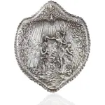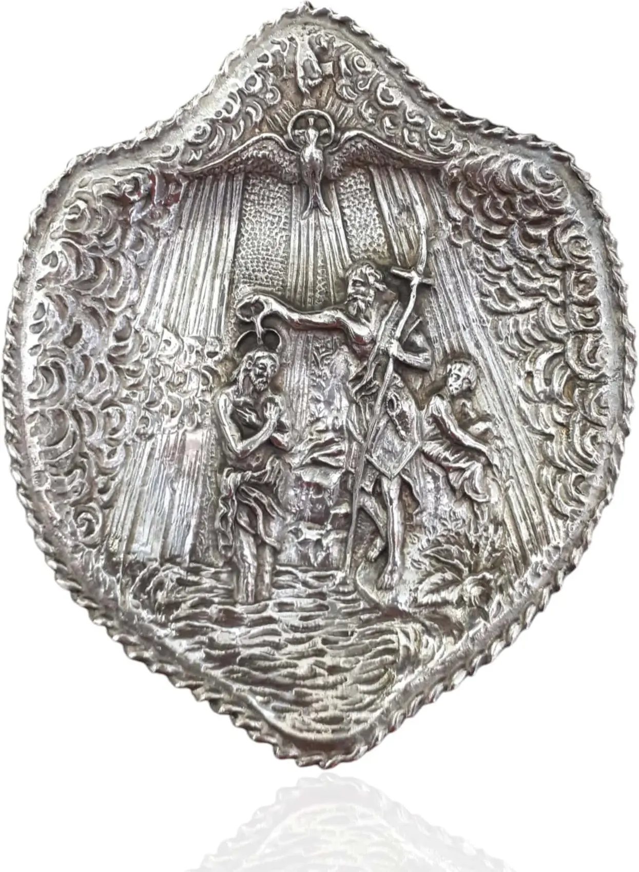 Concha de bautismo en plata de ley 925 con repujado que muestra a Juan Bautista bautizando a Jesús y, en la parte superior, la paloma que representa al Espíritu Santo, con acabado pulido y diseño elegante, ideal para la ceremonia.