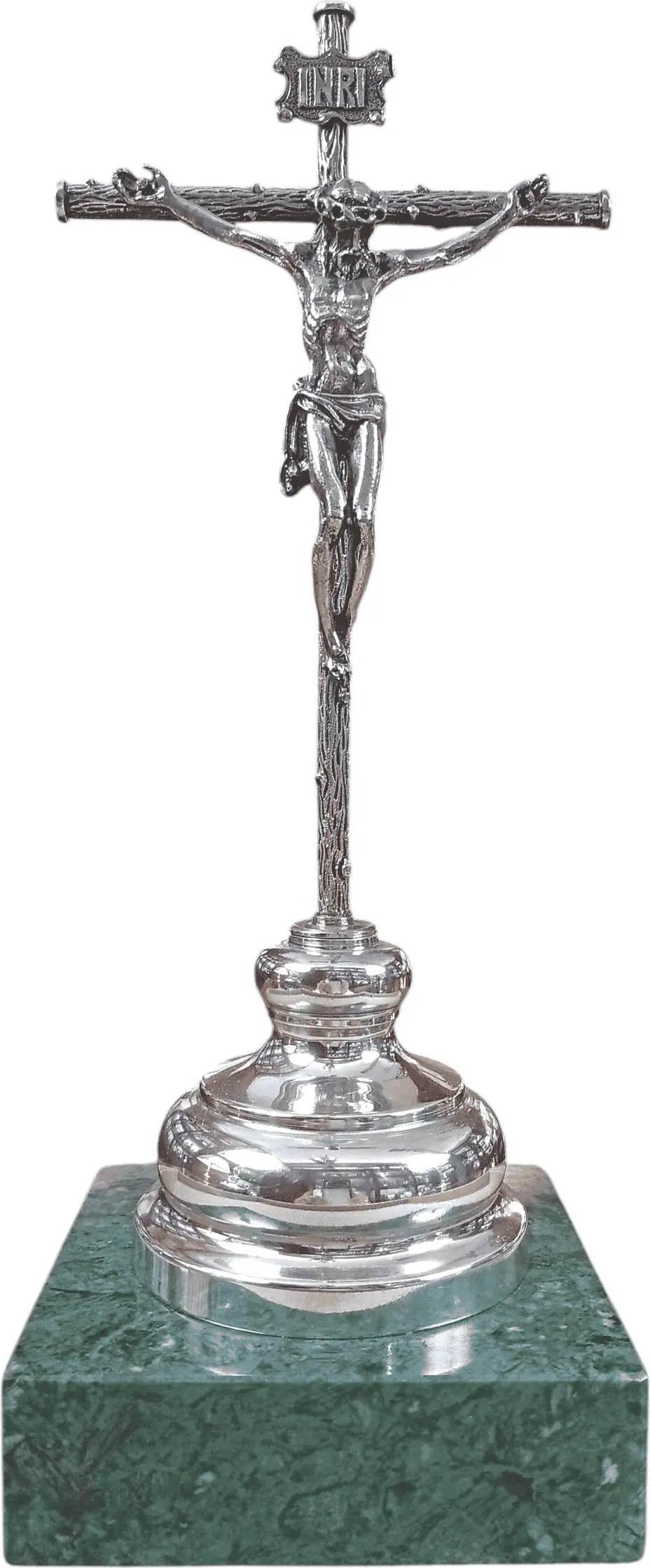 Crucifijo artesanal elaborado en plata de ley, montado sobre una base cuadrada de mármol verde pulido. La cruz presenta un acabado texturizado que imita la veta de la madera, y en ella se encuentra la figura de Cristo crucificado, esculpida con gran detalle anatómico. Sobre la parte superior de la cruz, una cartela con la inscripción “INRI” en relieve corona la composición.