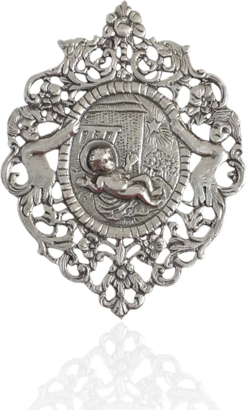 Medalla de cuna en plata de ley con niño Jesús en el pesebre.
