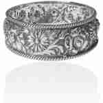 Se trata de una pulsera rígida, confeccionada en plata de ley de alta calidad, con un diseño floral repujado que recorre toda la superficie de la pieza. Cada flor está cuidadosamente moldeada en relieve, con pétalos, tallos y hojas que parecen emerger de la plata, creando un efecto tridimensional y delicado.