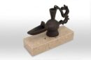 Reproducción en bronce de un candil de piquera, lámpara de aceite tradicional utilizada en la antigüedad, especialmente en culturas mediterráneas como la romana y la islámica. Esta pieza, montada sobre una base de piedra, destaca por su diseño histórico y su acabado artesanal, ideal como elemento decorativo o de colección para amantes de la historia y la arqueología.